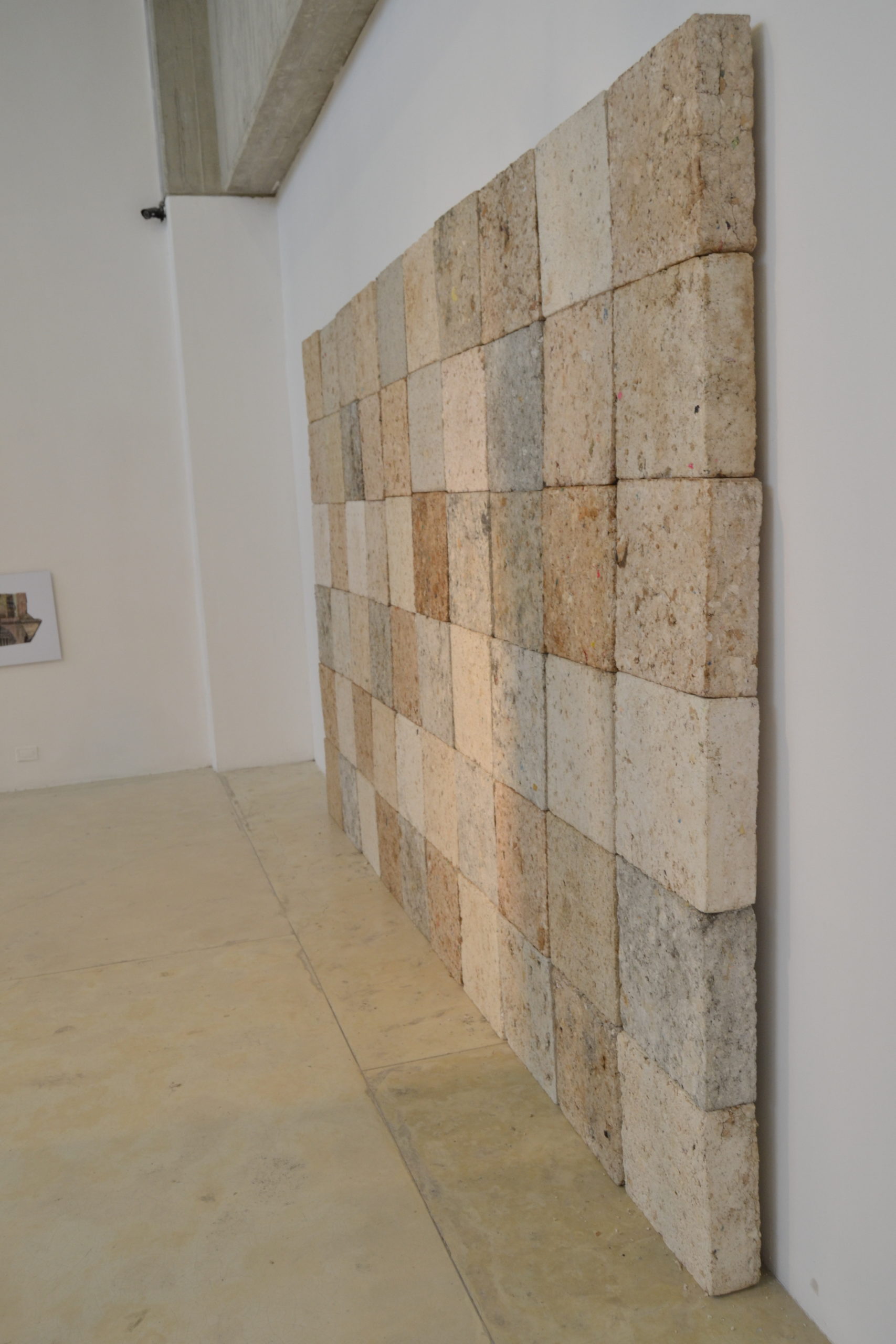 La obra conforma un muro de 2.28 metros de alto y 3.80 de largo, compuesto por 60 bloques fabricados a partir de papel reciclado. Los distintos colores vienen, en su mayoría, de un registro invisible: el paso del tiempo. Algunos bloques son grises y otros marrones o amarillentos. Para el artista, se trata de un amparo para el recuerdo de historias familiares y académicas.
