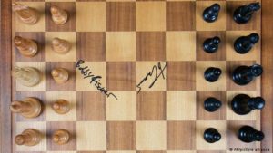 El legendario tablero de la partida entre Fischer y Spassky en 1972. Fotografía de AP | picture alliance Robert («Bobby») Fischer, el aspirante de Estados Unidos, no aparece...