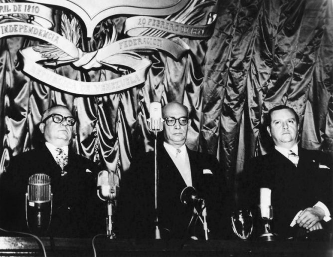 Rómulo Betancourt, presidente de la República (1959-1964) con el presidente y vicepresidente del Congreso Nacional, Raúl Leoni y Rafael Caldera, respectivamente. circa 1962. Fotografía del Archivo Fotografía Urbana