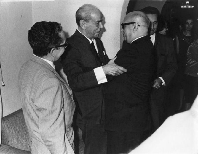 Saludo entre Rómulo Gallegos, expresidente de la República (1949) y Raúl Leoni, Presidente de la República (1964 -1969) Al fondo, Sonia Gallegos. Fotografía del Archivo Fotografía Urbana