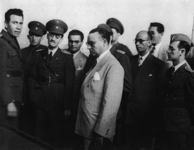 Reunión de miembros de la JRG y UPM. Martín Carrillo Méndez y Germán Odreman (UPM); capitán Mario Vargas, Gonzalo Barrios, Rómulo Betancourt, Raúl Leoni y Luis Beltrán Prieto (JRG); Rafael Alfonzo Ravard (UPM). Caracas, 1945. Fotografía del Archivo Fotografía Urbana
