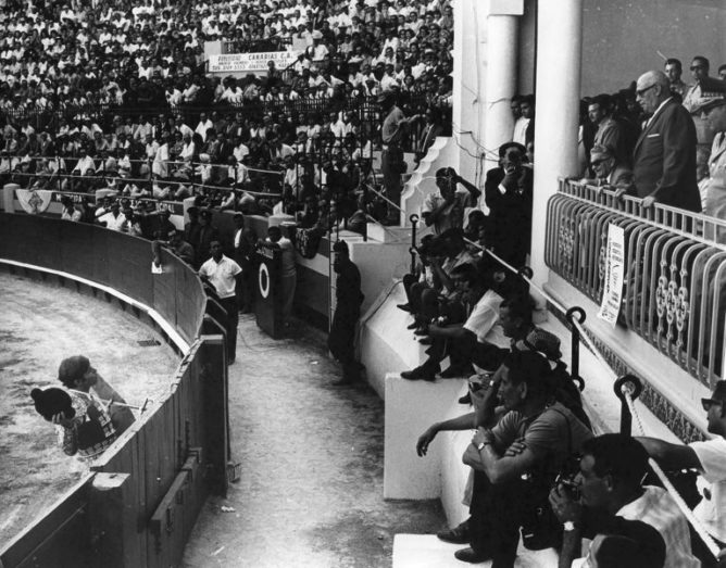 Manuel Benítez “El Cordobés” dedicando un toro a Raúl Leoni, Presidente de la República (1964-1969) en la Feria de Maracay. Gonzalo Barrios a la derecha del Presidente. Fotografía de Archivo Fotografía Urbana