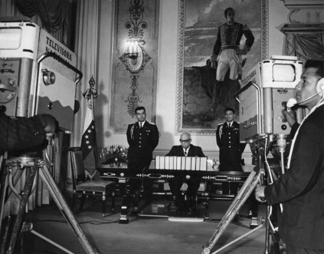 Alocución televisada de Raúl Leoni, Presidente de la República (1964-1969) en el Palacio de Miraflores. Fotografía del Archivo Fotografía Urbana