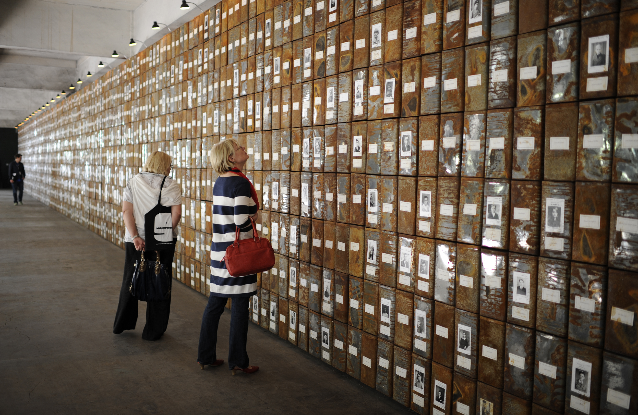 Visitantes contemplando la obra «Les registres du Grand Hornu» del artista francés Christian Boltanski durante la exposición «Manifesta», en Waterschei, Bélgica. Fotografía de John Thys | AFP.