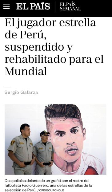 Volví a leer el artículo una vez más. Es una viñeta corta, una columna de 485 palabras, en donde el autor pinta de forma general el ambiente que se ha vivido en Perú a propósito de la clasificación de la selección de fútbol al mundial de Rusia 2018 y se centra brevemente en “la novela” alrededor de la participación de Paolo Guerrero. Había aparecido originalmente el domingo 24 de junio en la edición impresa de El País Semanal, y recién el miércoles 27, tres días después, como es habitual con muchos contenidos de ese suplemento, fue publicado en la página web del diario.