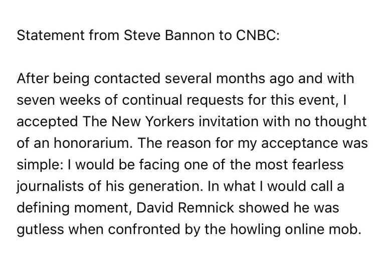 A statement from David Remnick, editor of The New Yorker, explaining his decision to no longer include Steve Bannon in the 2018 New Yorker Festival. pic.twitter.com/opayiw5GQ2