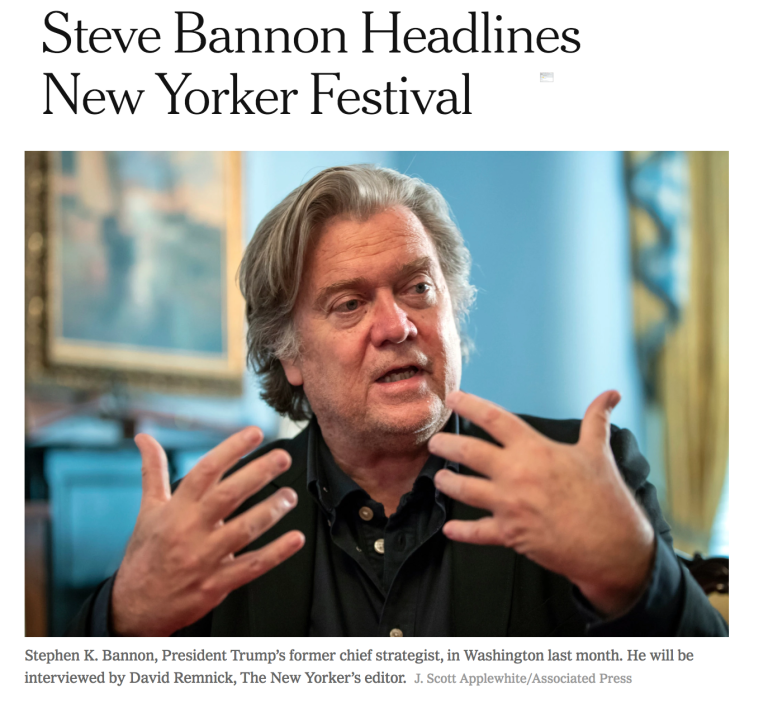 Seems @NewYorker lost sight of key distinction between warily hearing out and scrutinizing @SteveKBannon‘s views, and celebrating him as a Festival headliner. Like an honorary degree or distinguished lectureship, latter implies a measure of acclaimhttps://t.co/cwvYLhJZtx
