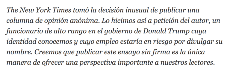 Si ustedes, como yo, siguen con cierta atención lo que ocurre en la política y la industria de medios norteamericana, sabrán ya que la semana anterior fue particularmente agitada. La cereza de la torta fue este Op-Ed (columna de opinión de una firma invitada) publicado el miércoles 5 de setiembre por The New York Times. La columna se titulaba, de forma grandilocuente, “Soy parte de la resistencia dentro del gobierno de Trump” (aquí pueden leerla en español), y no llevaba firma.