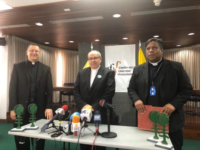El subsecretario de Asuntos Pastorales de la CEV, Presbítero Gerardo Salas; el presidente de la Comisión Episcopal de Comunicación y Obispo Auxiliar de Caracas, Monseñor Tulio Ramírez, y el director del Departamento de Comunicación de la CEV, Presbítero Pedro Pablo Aguilar. Fotografía de la Conferencia Episcopal Venezolana.